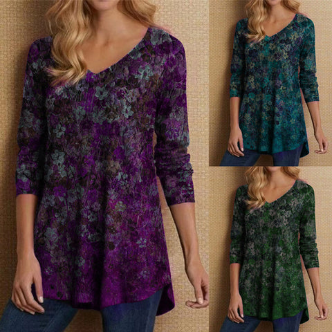 Feature: V neck, long sleeve, flare uneven hemline can hide belly and print decoration.