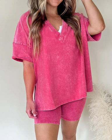 A wardrobe essential, our stonewashed set includes a comfy tee and biker shorts with an elastic waistband.