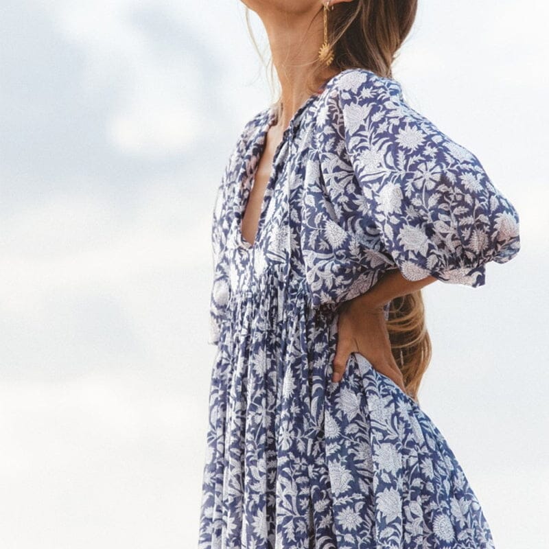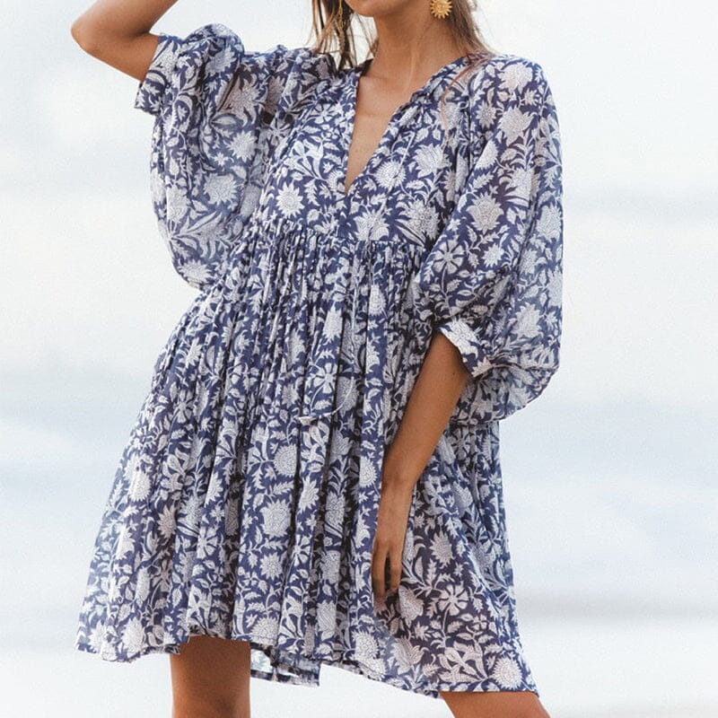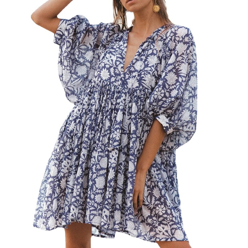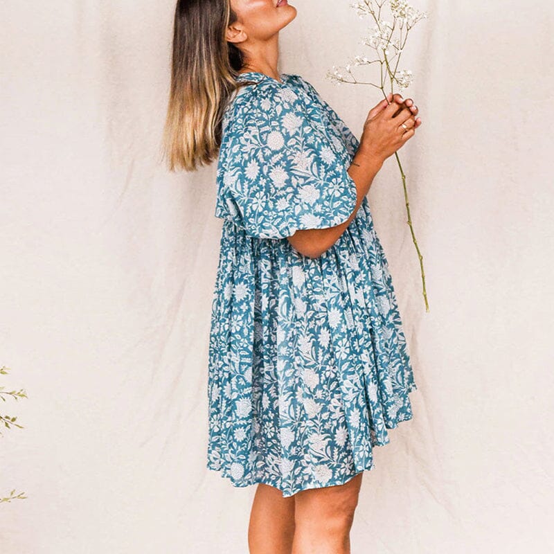 Floral string loose dress is above knee length. It has v neck, short sleeve and irregular curved hem. This dress is perfect for lounging, sleeping & matches with your daily leisure. Ideal for day relaxing, will keep you decent when guests visit. It is cool, comfortable and cozy and great for your girlfriend, wife, mother and sister as a birthday gift.