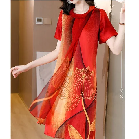 Women's Retro Printing Temperament Chiffon Skirt in a simple design with a knee-length cut for everyday wear and formal occasions.