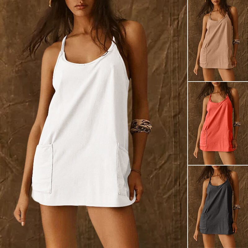 A Fun Addition To Your Wardrobe In This Summer! This soft dress is featured in a mini-length and lightweight fabrication with oversized patch pockets and built-in shorts.