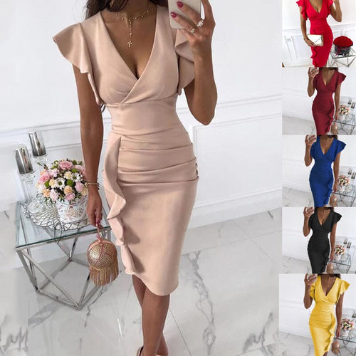 V-Neck Ruffle Hem Ruched Dress